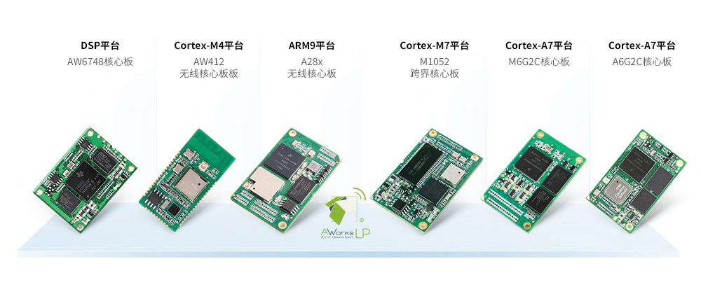 AWorksLP平台可支持Cortex®-M0/3/4/7、Coterx-A7/8/9、Arm7™/Arm9™、DSP等常用内核。致远电子推出了一系列搭载AWorksOS操作系统的各平台核心板。使用这些核心板,即可在AWorksOS平台上快速完成产品开发。