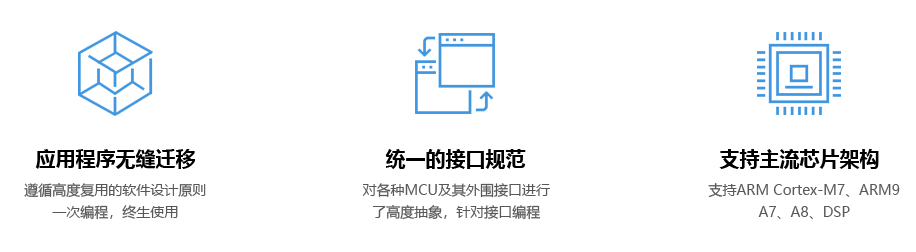 AWorksLP工业智能物联开发平台制定了统一的接口规范,并对各种MCU内置的功能部件与外围器件进行了高度的抽象,因此无论你选用的是Arm®还是DSP,以高度复用的软件设计原则和只针对接口编程的思想为前提,则应用软件均可实现“一次编程、终生使用、跨平台”。