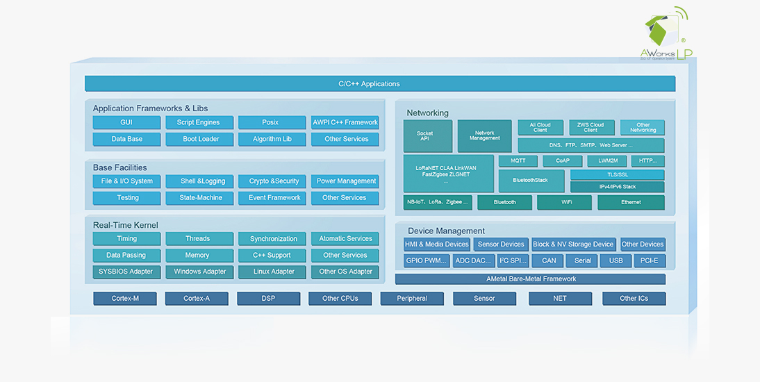 AWorksLP平台内置众多协议栈,市面上的主流协议均可支持,且AWorksOS平台采用动态可裁剪的理念设计,用户可自主选择搭载需要的协议栈。
