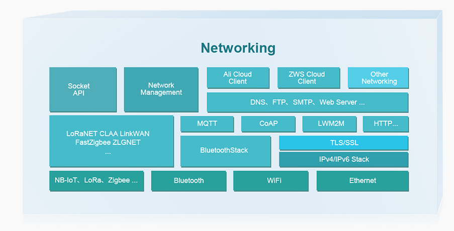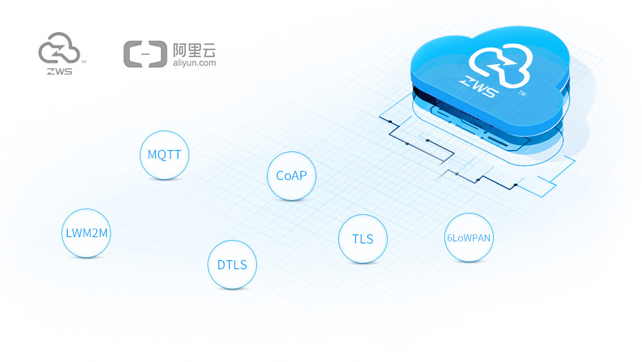 AWorksLP和loT OS支持6LoWPAN、TLS、DTLS、CoAP、MQTT、LWM2M等物联网关键协议栈,支持并提供阿里云、机智云等云的接入解决方案。