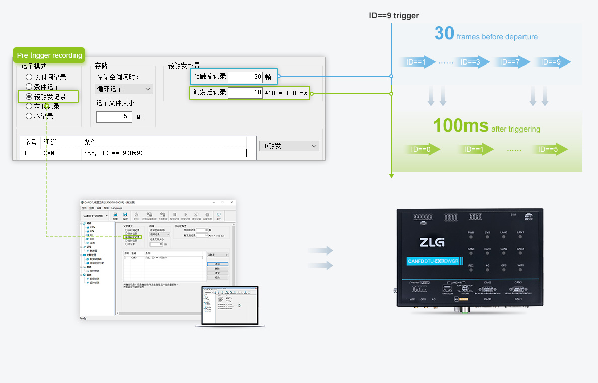 CANFDDTU-400EWGR provides Trigger button that can mark CANFD message data in real time, facilitating users to easily locate the record file in SD card and quickly locate the fault.