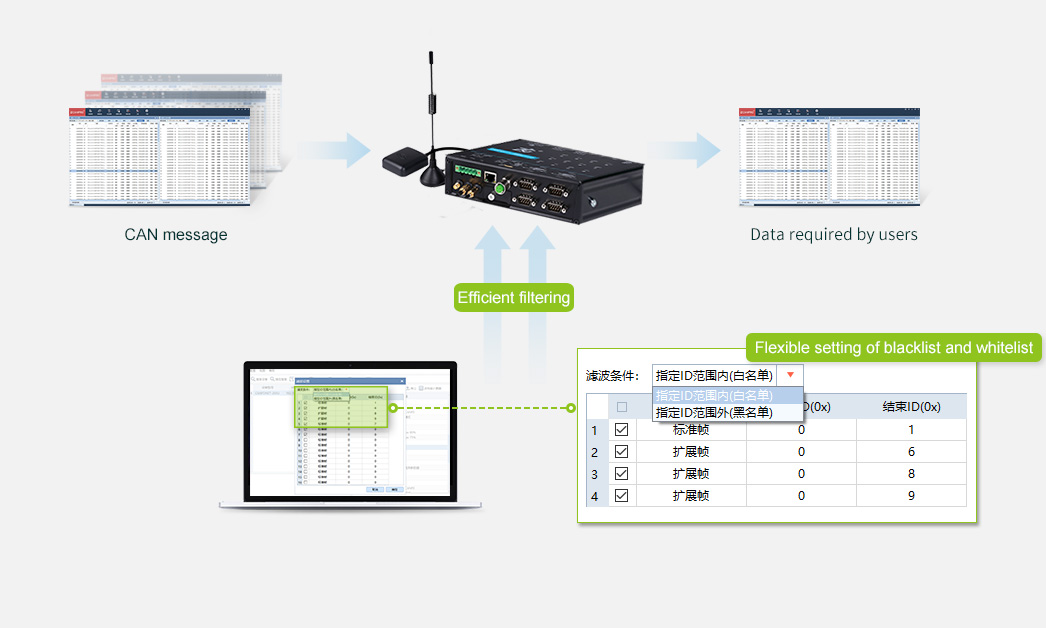 The configuration tool supports up to 64 filtering rules per channel, and performs filtering configuration according to ID. Meanwhile, blacklist and whitelist can be added for recording, and channel can independently enable filter and filtering mode.