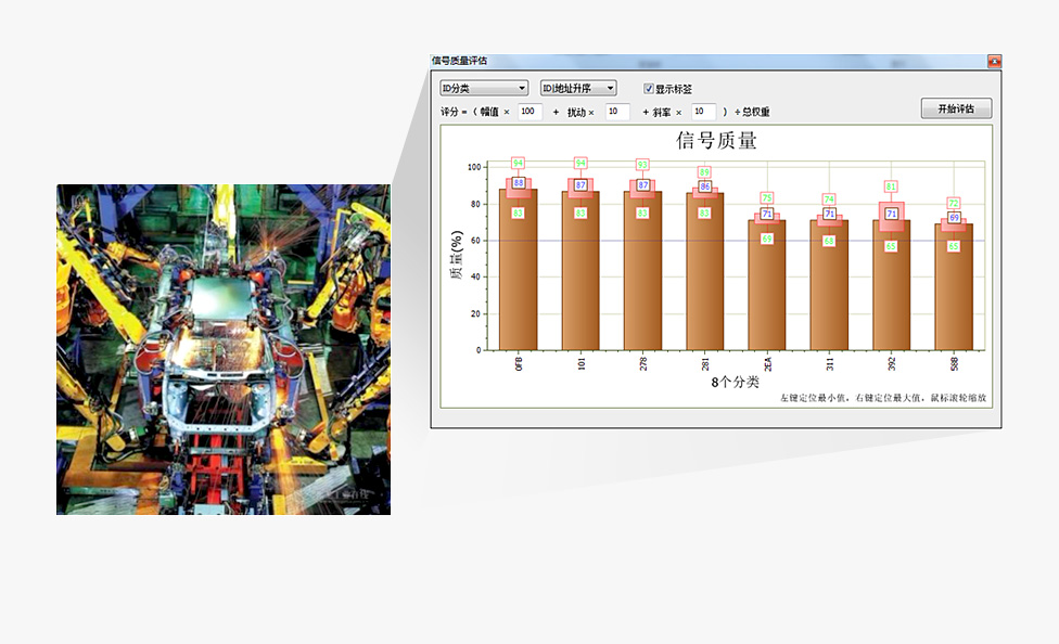 是我们给上海通用汽车做的节点信号质量测试软件,也可以通过分析每个焊接机器人CAN节点发出的波形,自动对其的最小电压幅值、最大电压幅值、信号幅值、波形上升沿时间、波形下降沿时间、信号时间进行综合“评分”,然后通过柱状图来直观显示出每个CAN帧ID的信号质量。便于出厂和日常维护检修。[ 了解详细过程 ]