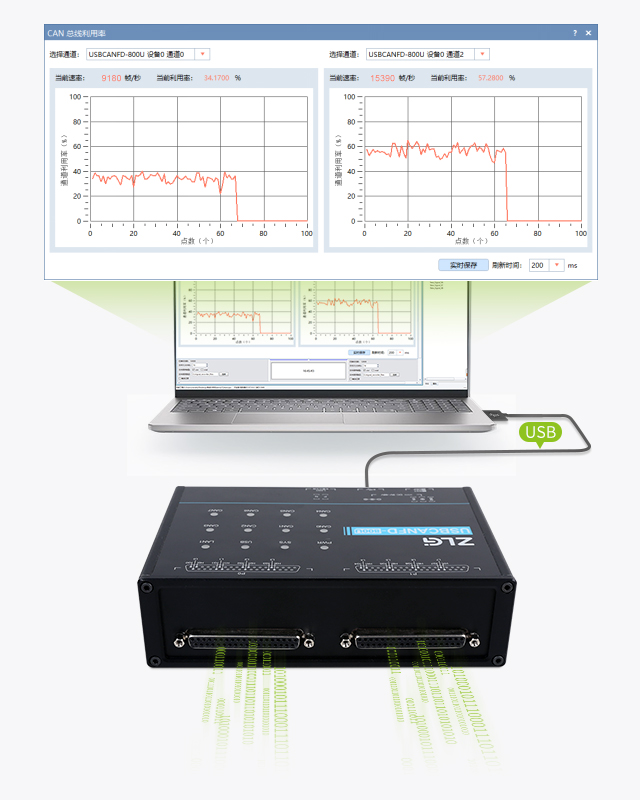 USBCANFD-800U supports real-time reporting of bus utilization. After configuring ZXDoc/ZCANPRO software, users can read the bus load rate through the hardware device, accurately grasp the bus load information, and prevent abnormal intrusion.