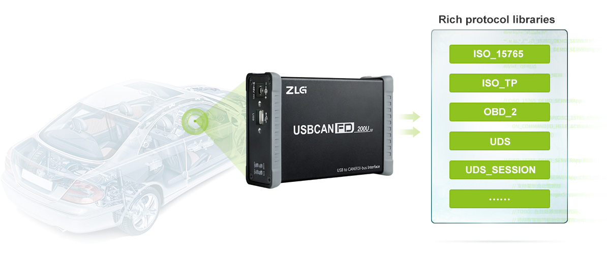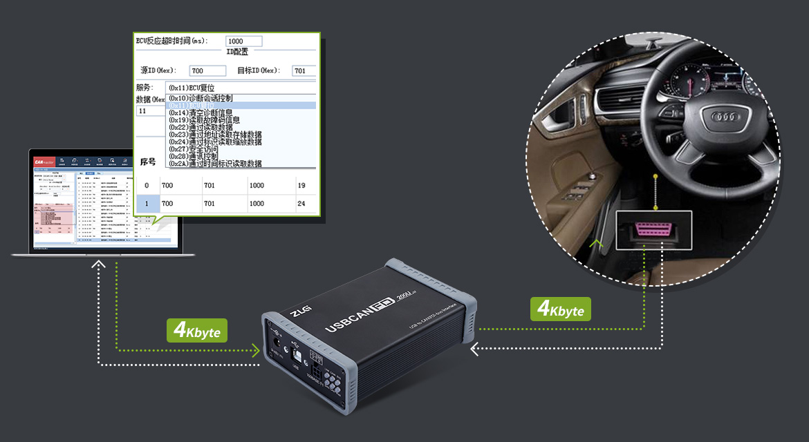 Users can directly perform standard UDS diagnostic operations on vehicles through the USBCANFD interface card, with a maximum transmission capacity of 4Kbyte data per operation.