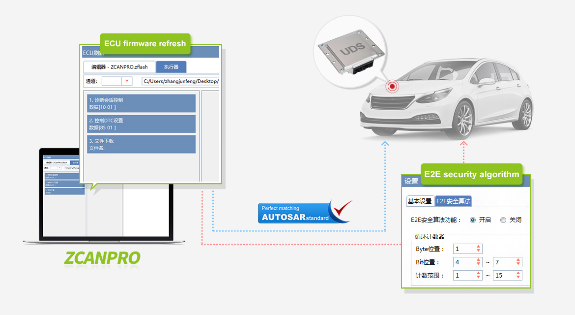ZCANPRO supports ECU refresh and E2E security algorithm, provides UDS protocol services, adds flashing files and applies actuators to easily complete ECU data security and fast refresh.