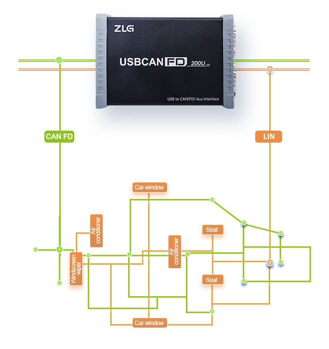 USBCANFD-800U is connected to the CAN FD network through USB. It can synchronously monitor and collect the data of 8-channel CAN FD buses at most and, coordinate with the integrated analysis process of the upper computer, and conduct in-depth diagnosis and analysis on the vehicle bus. It makes automobile engineering simple.