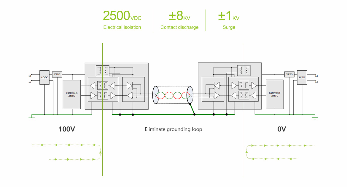 1~2-channel CAN FD interfaces of USBCANFD interface card have 2500VDC electrical isolation, with static electricity levels of contact discharge ± 8KV and surge ± 1KV, and can effectively avoid backflow damage caused by different node ground potentials. It is especially suitable for testing electric vehicles and trains.
