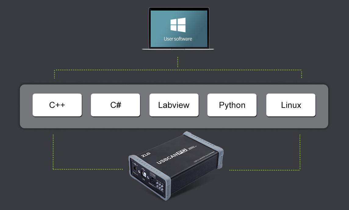 The USBCANFD interface card provides a secondary development library that supports various mainstream development environments such as VC, VB, C#, LINUX, Labview, LabWindows, and Delphi7. It carries advanced protocol packages such as DBC and UDS. You can seamlessly switch between different interfaces only by changing the device type, which is efficient and easy to use.