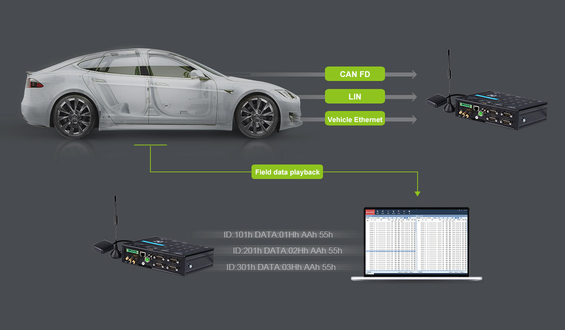 CANFDDTU-400EWGR can meet the requirements of various application scenarios. It can synchronously monitor and collect the data of CAN FD bus, LIN bus and vehicle Ethernet in different scenarios, and upload the data to the designated cloud server in real time through 4G communication.