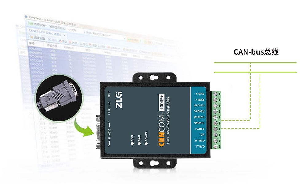 CANCOM-100IE+ three-in-one industrial intelligent protocol converter can quickly connect RS-232/485/422 communication device to CAN-bus field bus and realize two-channel communication.