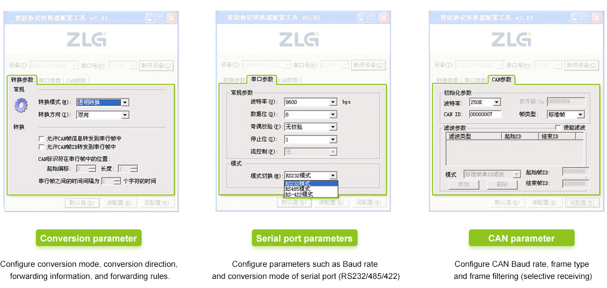 The converter supports a serial port rate of 600~230400bps and a CAN-bus communication rate of 5Kbps~1Mbps. It provides 3 data conversion modes (transparent conversion, transparent band identification conversion and format conversion) to meet the requirements of different customers. Its interfaces are designed at industrial grade. CAN interface is equipped with a magnetic coupling isolation module, which can avoid the damage caused by ground circulation and has strong anti-static and surge capabilities that allow its applications in a harsh environment.