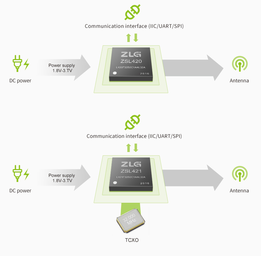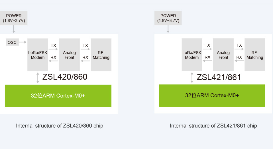 ZSL420/ZSL421/ZSL860/ZSL861 are four LoRa intelligent networking chips, and support various modulation modes such as LoRa, FSK and GFSK. Combined with spectrum broadening processing technology, the long-distance communication problem of small data in a complex environment is solved. The operating frequency of ZSL420/ZSL421 is 470MHZ~510MHz, and the operating frequency of ZSL860/ZSL861 is 863MHZ~870MHz. They support the transparent transmission protocol for embedded ad hoc network and one-click networking, and provide LinkWAN protocol, CLAA protocol and LoRaWAN protocol (only ZSL420/ZSL421). The chip has a built-in open 32-bit Arm® Cortex®-M0+ core, a basic frequency of 48MHz, 256 KB Flash, and 32KB SRAM, which is convenient for users to redevelop the functions. It is an excellent choice in the wireless communication field of IoT.