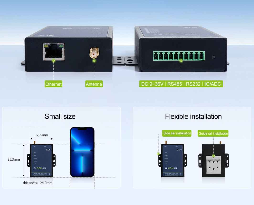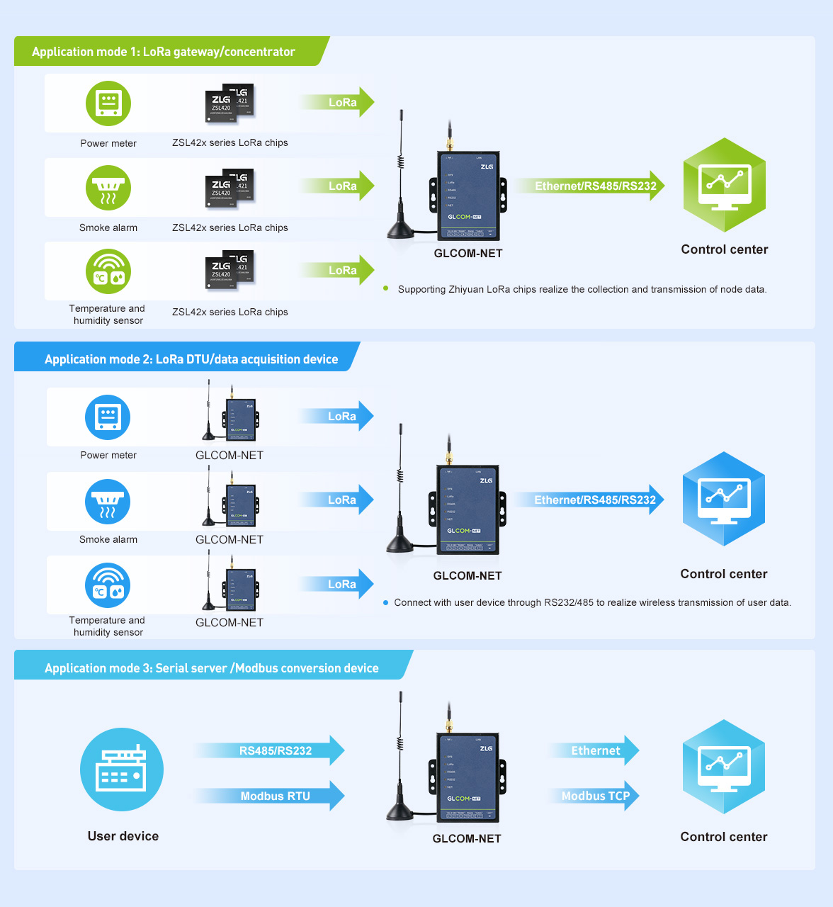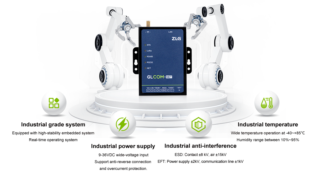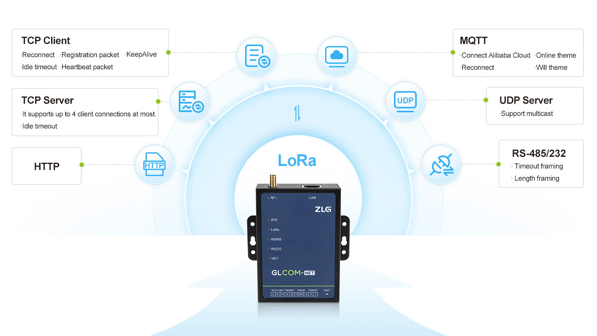 GLCOM-NET is an intelligent wireless data communication gateway developed by Zhiyuan Electronics. Adopting LoRa wireless technology, it has realized the functions of ad hoc network, transparent transmission of wireless data to TCP, UDP, MQTT, HTTP and RS485/232, greatly simplifying the complicated development process of wireless products, and enabling your products to enter the market quickly at lower cost. It can be widely applied in industrial IoT applications.